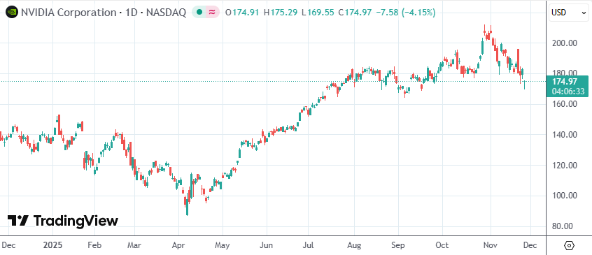 周二(11月25日)美股早盘,英伟达股价大幅走低,日内一度跌超7%报169.55美元,较上月录得的历史高位回落了逾20%。
