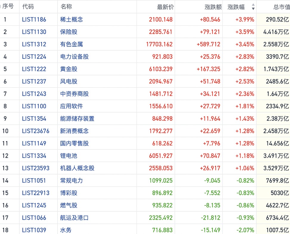 其他方向上,大金融板块涨幅居前,助力大市上行,保险股走势强劲。此外,有色板块再度全线上扬,新消费、锂电、钢铁、建材等行业纷纷跟涨。而下跌的板块中,航空、餐饮股逆势走低。