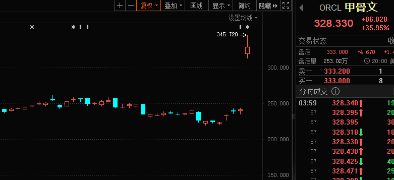 美东时间9月10日,美股巨头甲骨文公布2026财年一季度财报后,股价单日破纪录暴增,盘中涨幅一度超过40%,收盘时涨近36%,股价达历史新高,收盘为328.33美元/股,公司市值超9300亿美元。