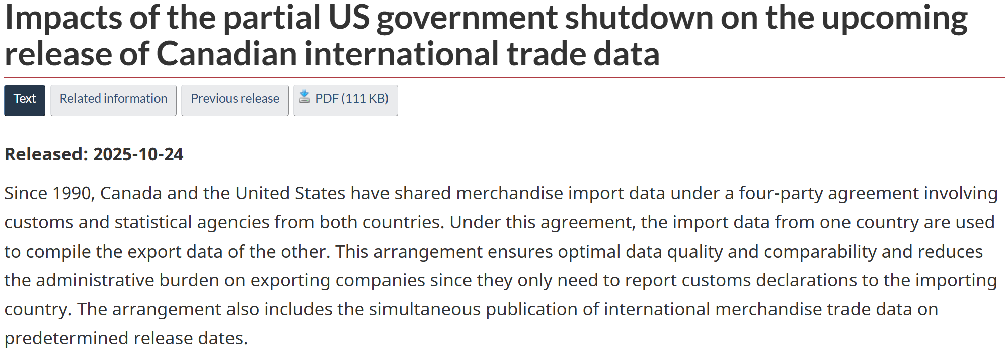 由于国际经济数据之间的勾稽关系,整个10月持续关门的美国政府,已经影响到加拿大无法正常发布贸易数据了。