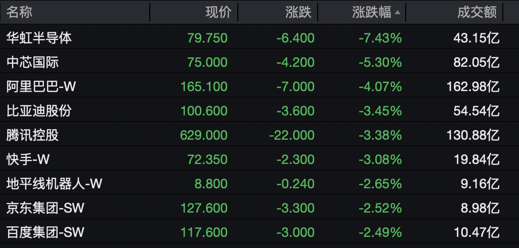 华虹半导体、中芯国际分别下跌7.43%、5.30%。阿里巴巴、腾讯控股、快手分别下跌4.07%、3.38%、3.08%。阿里巴巴和腾讯控股成交额超百亿港元。