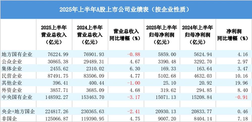 从企业性质看,上半年非国有企业营收、净利实现双增长,央国企营收出现下滑。