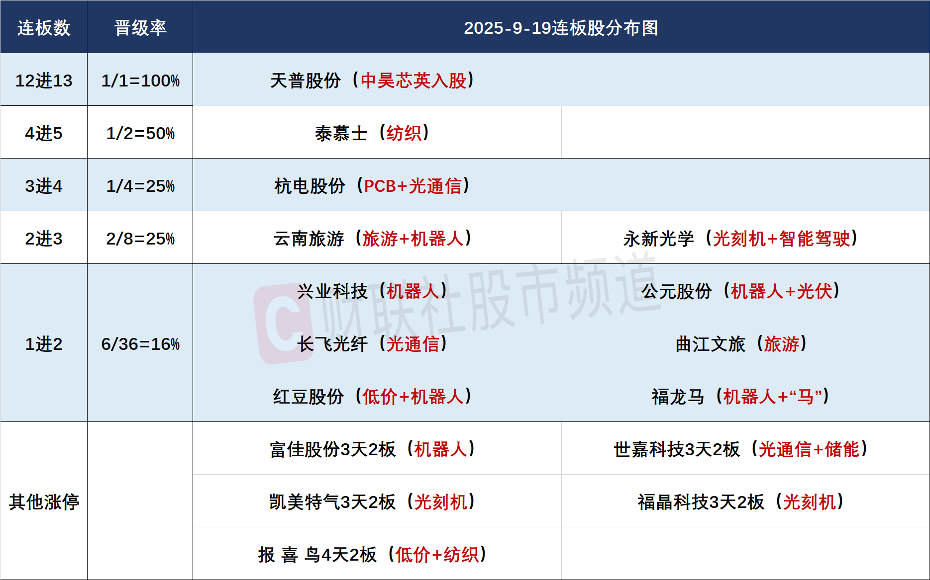 财联社9月19日讯,今日50股涨停,23股炸板,封板率为68%,天普股份13连板,泰慕士5连板,杭电股份4连板,云南旅游、永新光学3连板,长飞光纤4天3板,世嘉科技7天3板。市场全天震荡走弱,三大指数集体收跌。量能大幅萎缩,沪深两市成交额2.32万亿,较上一个交易日缩量8113亿。板块方面,能源金属、旅游、光刻机等板块涨幅居前,机器人、工业母机等板块跌幅居前。截至收盘,沪指跌0.30%,深成指跌0.04%,创业板指跌0.16%。